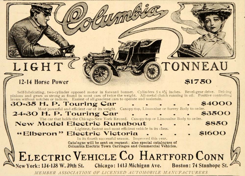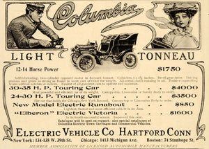 This is an original 1904 black and white print ad for the Columbia Light Tonneau 12-14 horse power, 30-35 horse power Touring Car, 24-30 horse power Touring Car, New Model Electric Runabout and the "Elberon" Electric Victoria by Electric Vehicle Company located in Hartford, Connecticut. There are other locations at 134-38 West 39th Street, New York City, New York; 1413 Michigan Avenue, Chicago, Illinois and 74 Stanhope Street, Boston, Massachusetts.