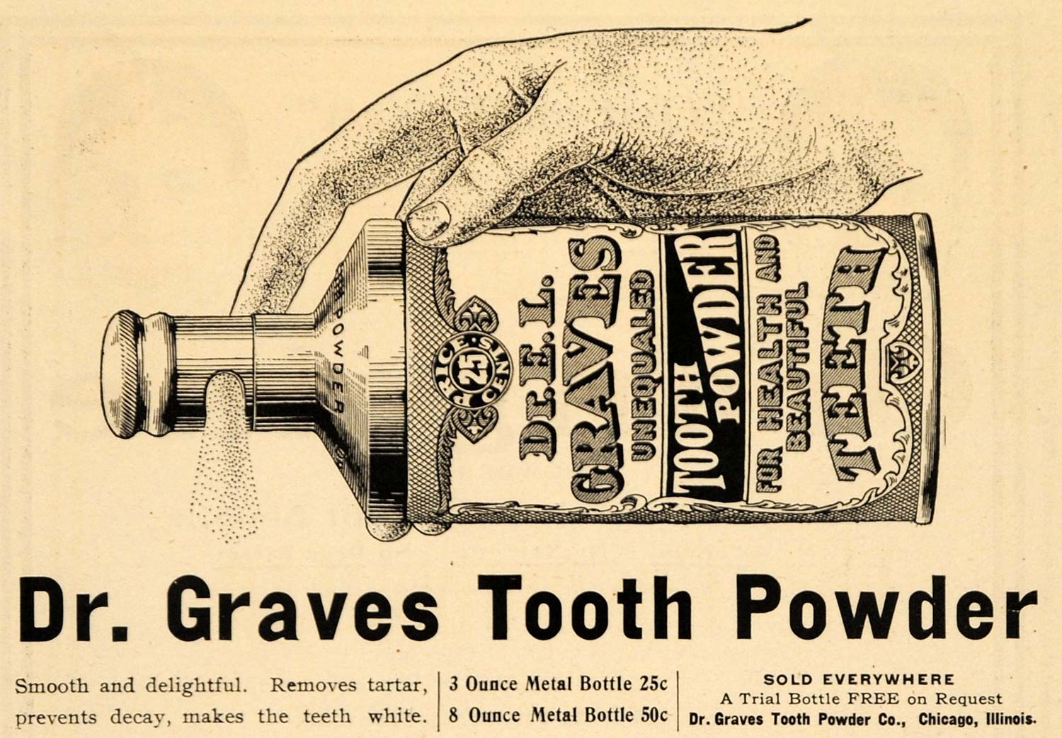 This is an original 1904 black and white print ad for Dr. E. L. Graves Tooth Powder for healthful and beautiful teeth, by Dr. Graves Tooth Powder Company in Chicago.