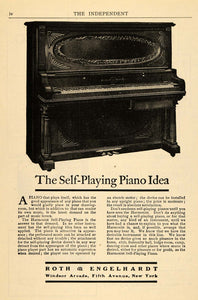 This is an original 1904 black and white print ad for the Harmonist Self-Playing Piano, a product by Roth & Engelhardt, located in Windsor Arcade on Fifth Avenue in New York.