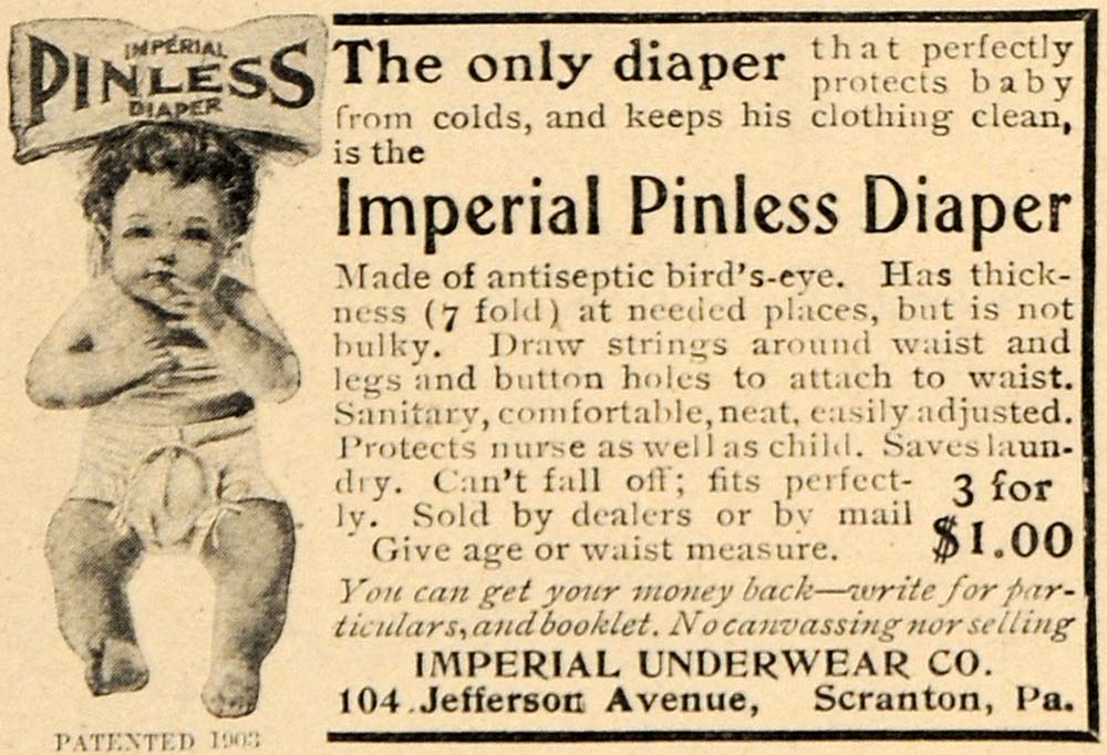 This is a small original 1904 black and white print ad for the Imperial Pinless Diaper from the Imperial Underwear Company of Scranton, Pennsylvania. The ad writes, "Made of antiseptic bird's-eye. Has thickness at needed places, but is not bulky."