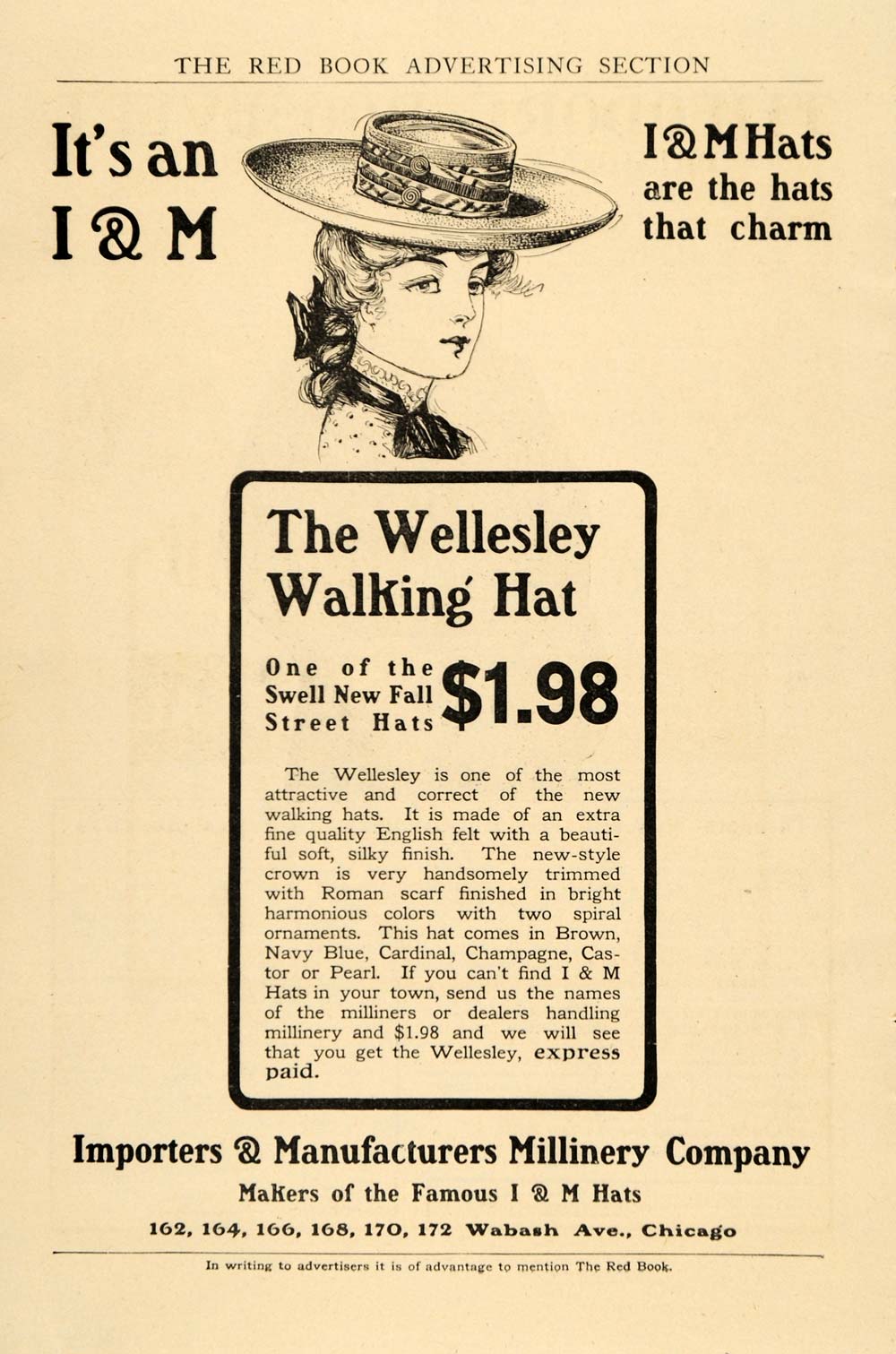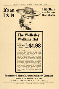 This is an original 1904 black and white print ad for The Wellesley Walking Hat by the Importers & Manufacturers Millinery Company. There are locations at 162, 164, 166, 168, 170, 172 Wabash Avenue, Chicago.