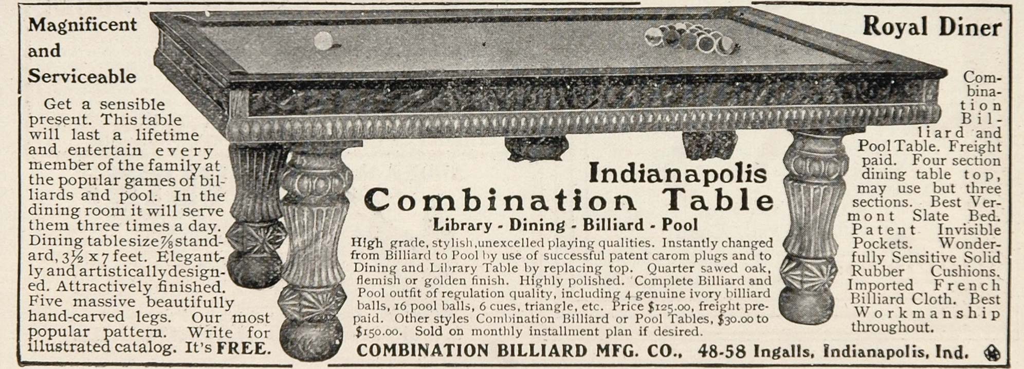 This is an original 1904 black and white print ad for the Indianapolis Combination Library--Dining--Billiard--Pool table from the Combination Billiard Mfg. Co., 48-58 Ingalls, Indianapolis, Indiana.