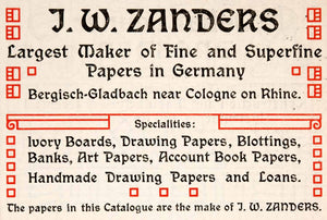 This is an original 1904 two-color print ad for paper from J. W. Zanders, of Bergisch-Gladbach, Germany, near Cologne.