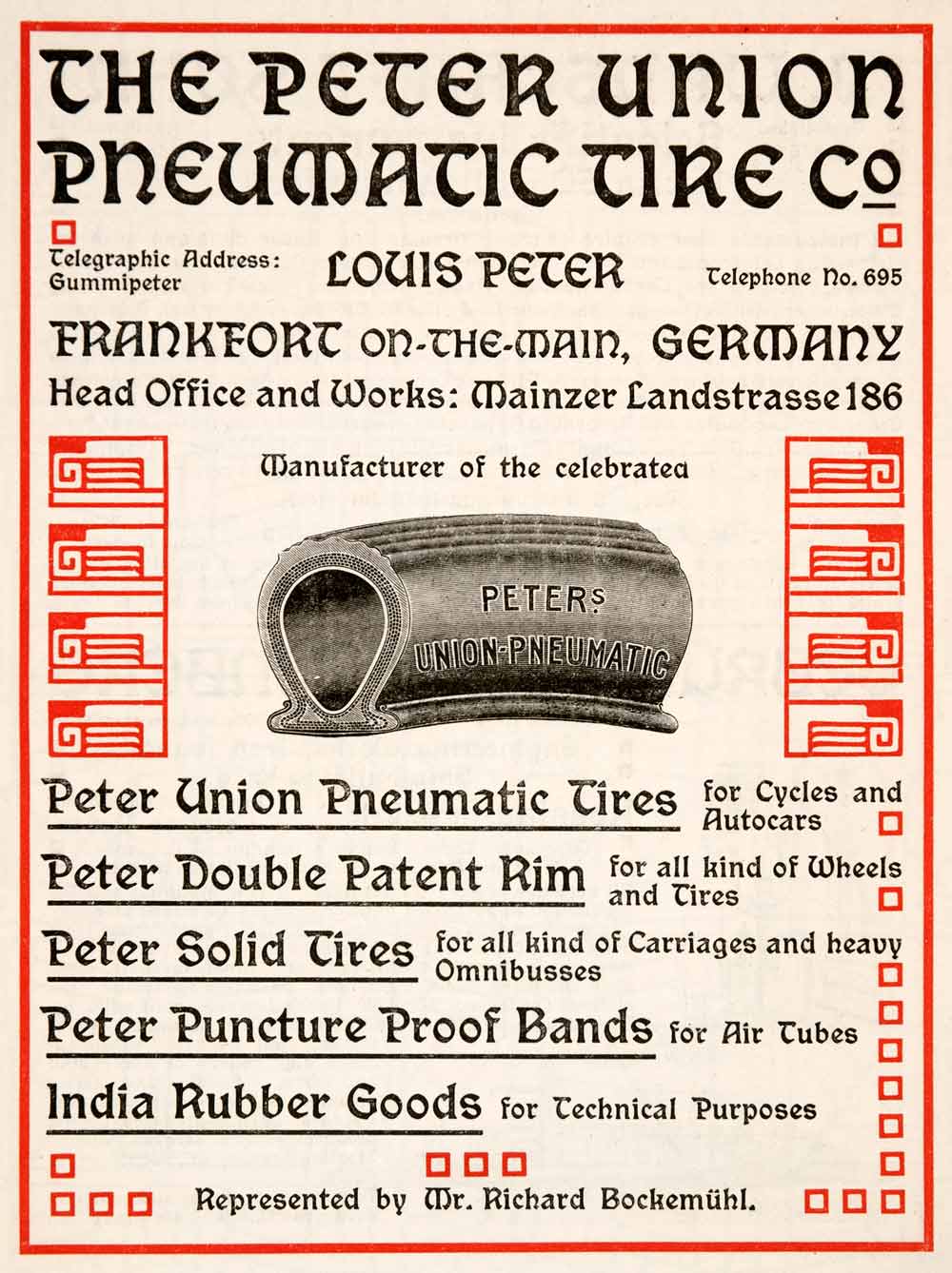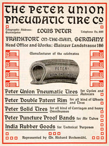 This is an original 1904 two-color print ad for The Peter Union Pneumatic Tire Company of Frankfort am Main, Germany (Deutschland). The advertisement features the Union pneumatic tires, the double patent rim, solid tires, puncture proof bands, and India rubber goods.
