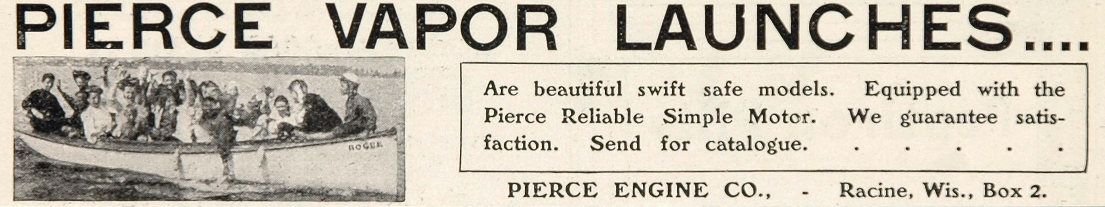 This is an original 1904 black and white print ad for Pierce Vapor Launches from the Pierce Engine Co., Racine, Wisconsin. The ad has a small but nice illustration of one of these vintage boats. An excellent original historical image for framing.
