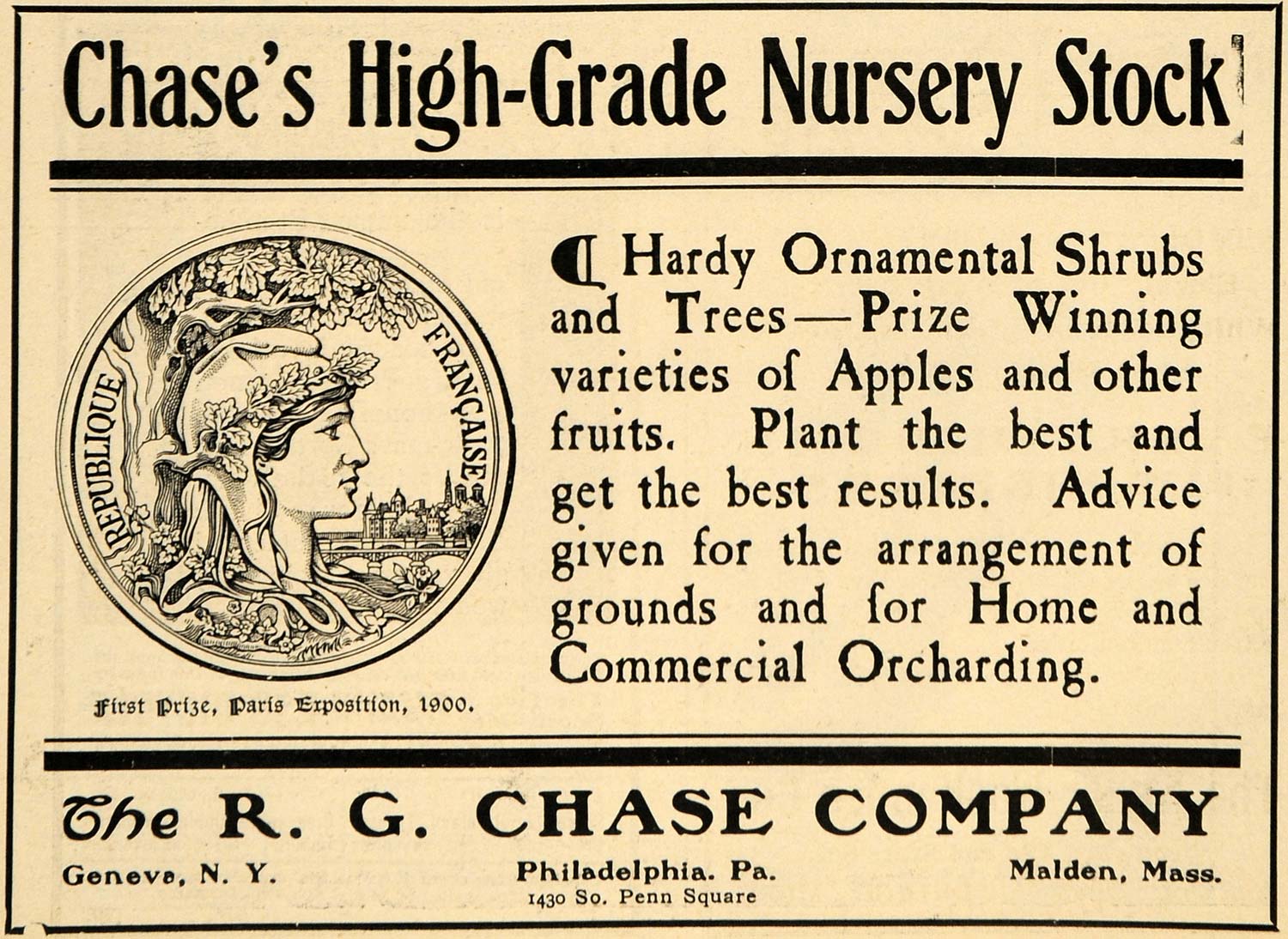 This is an original 1904 black and white print ad for the Chase's High-Grade Nursery Stock promoting ornamental shrubs and trees from R. G. Chase Company located in Geneva, New York.
