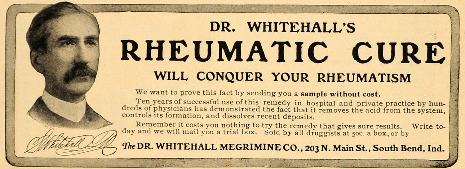 This is an original 1904 black and white print ad for Dr. Whitehall's Rheumatic Cure for rheumatism, from The Dr. Whitehall Megrimine Co., 203 N. Main St., South Bend, Indiana.
