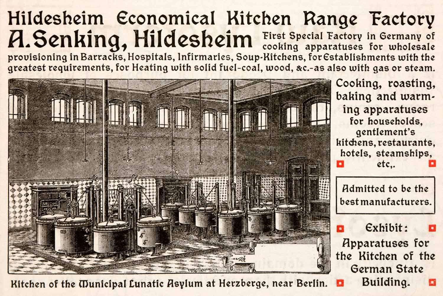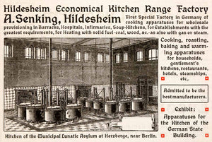 This is an original 1904 two-color print ad for Hildesheim kitchen ranges from A. Senking of Hildesheim, Germany (Deutschland).