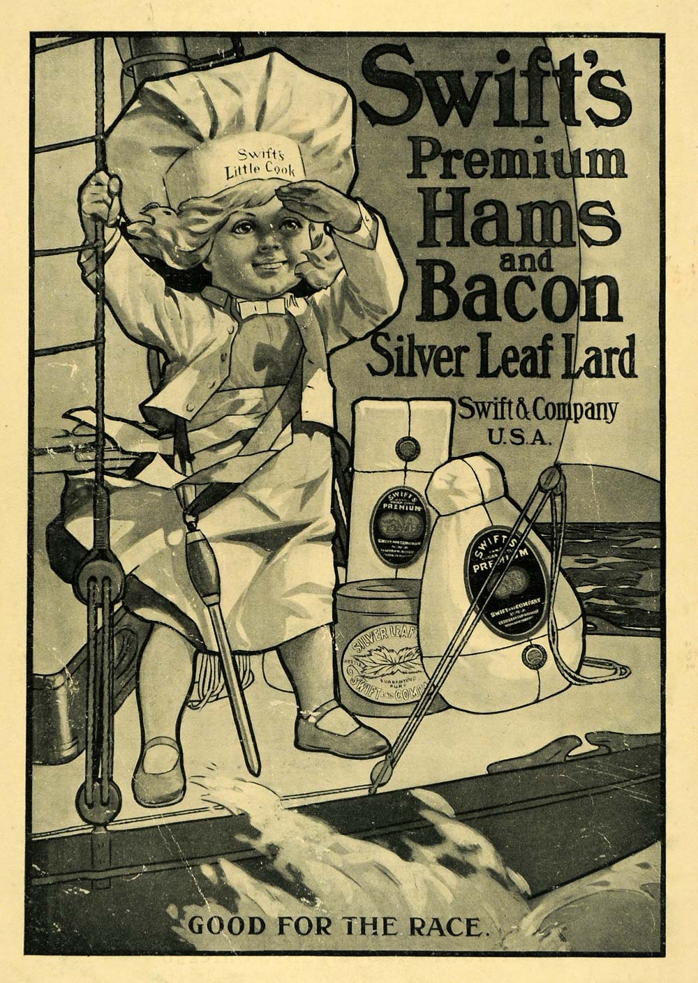 This is an original 1904 color print ad for the Swift's Premium Hams and Bacon Silver Leaf Lard from