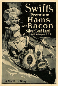 This is an original 1904 black and white print ad for Swift's Premium Hams, Bacon and Silver Leaf Lard by Swift and Company. This ad has an illustration of Swift's Little Cook canoeing down a river with a lot of meat onboard.