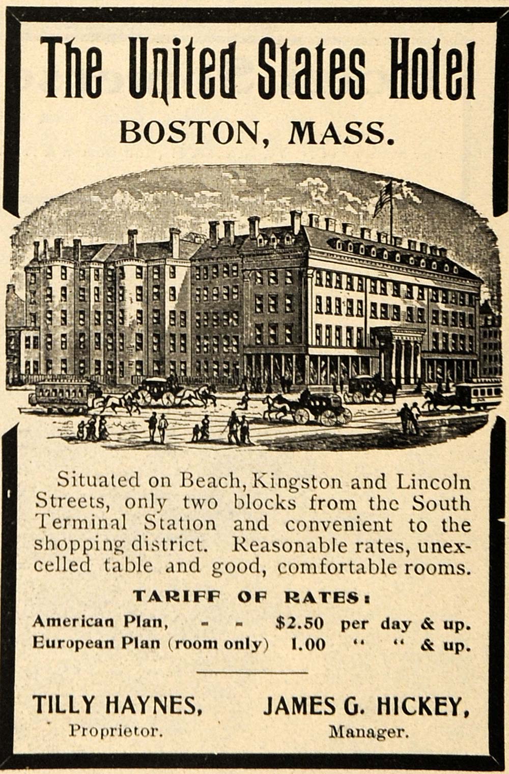 Keywords specific to this image: Vintage Advertising, Vacation, Rates, James G. Hickey, Horse Drawn Carriages
