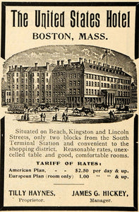 This is a small original 1904 black and white print ad for The United States Hotel in Boston, Massachusetts.