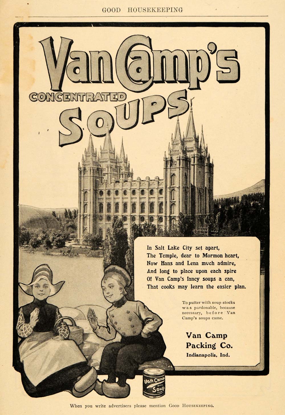 This is an original 1904 black and white print ad for Van Camp Packing Co. of Indianapolis, Indiana, makers of Van Camp's Concentrated Soups. Pictured in the ad is the Mormon Temple in Salt Lake City, Utah.