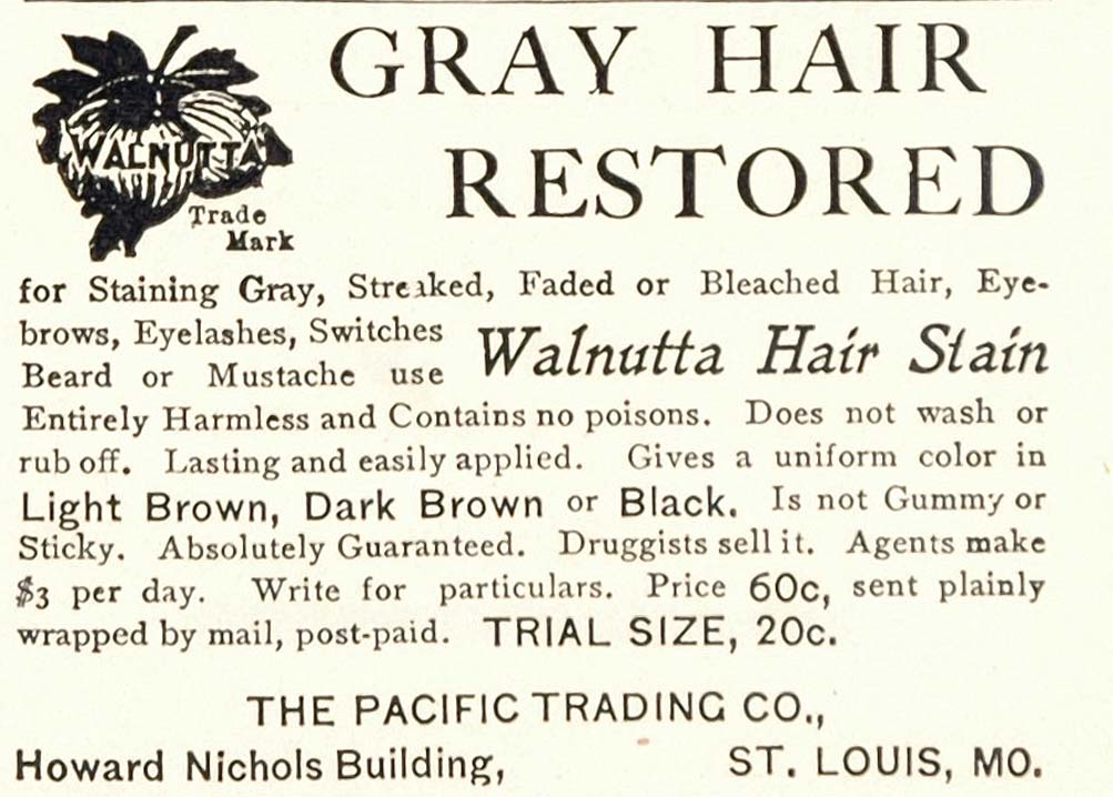 This is an original 1904 all-text black and white ad for Walnutta Hair Stain, from The Pacific Trading Co., Howard Nichols Building, St. Louis, MO.