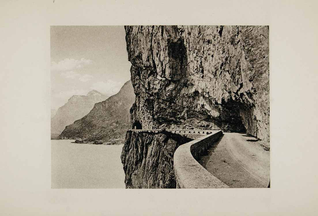 This is an original 1904 photogravure of the Axenstrasse on Lake Lucerne in Switzerland.