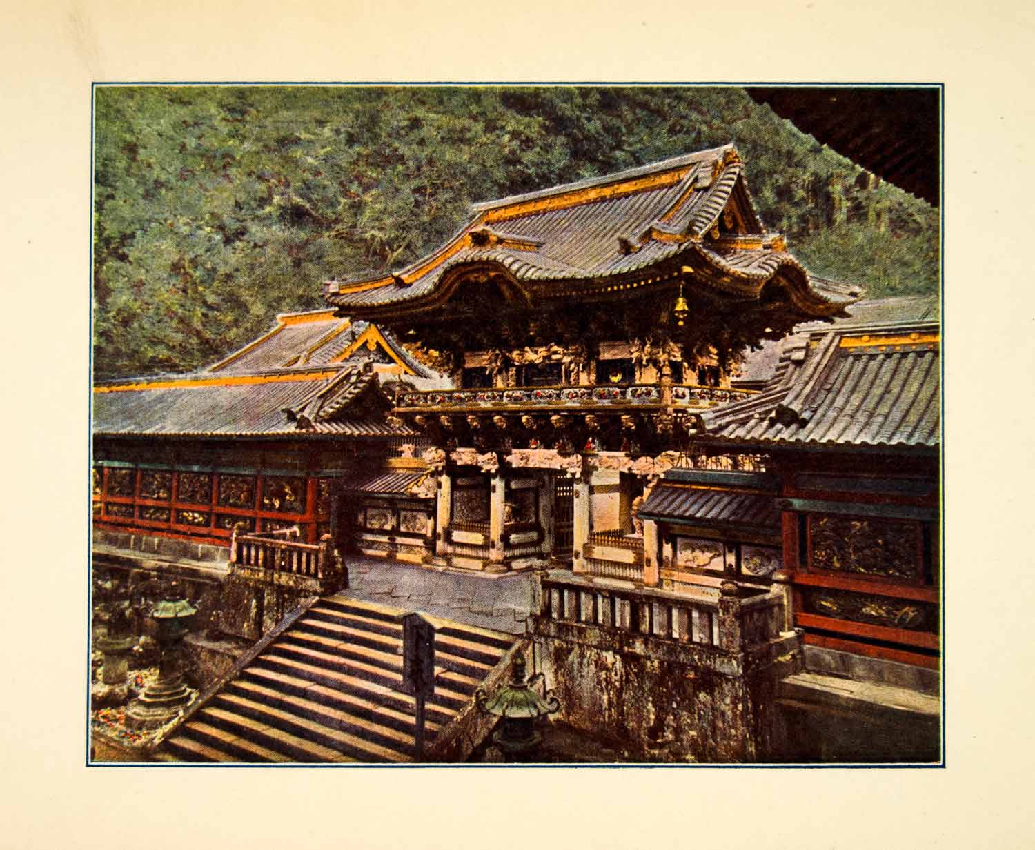 This is an original 1904 color print of the Yomeimon gate on the South side of the Tosho-gu Temple in Nikko, Japan. This awe inspiring gate is reputed to be so ornately designed that people will stand from sunrise to sunset just looking on it.
