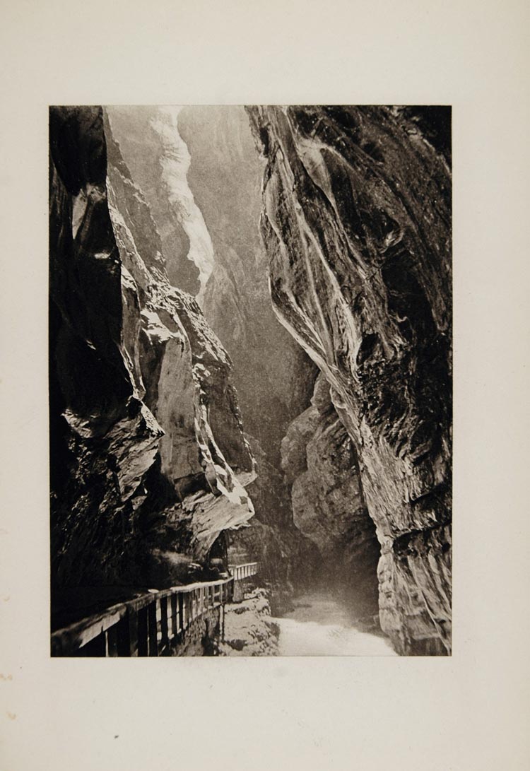 This is an original 1904 photogravure of the wooden walkway in the Gorge of the Tamina, or Taminaschlucht, in Switzerland.