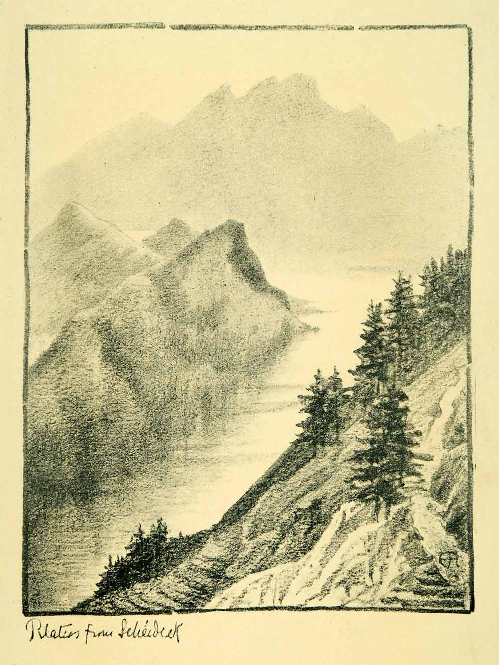 This is an original 1904 duotone halftone print of a pencil sketch of "Pilatus from Scheideck," by Edith Rawnsley. The Pilatus is a mountain near Lucerne, Switzerland.