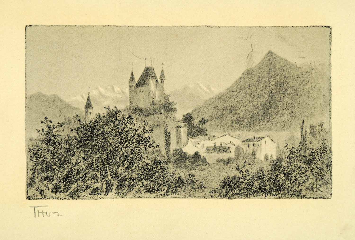This is an original 1904 black and white halftone print of a pencil sketch of "Thun," by Edith Rawnsley. Thun is in the canton of Bern, Switzerland. In the distance is Thun Castle (Zahringen Castle).
