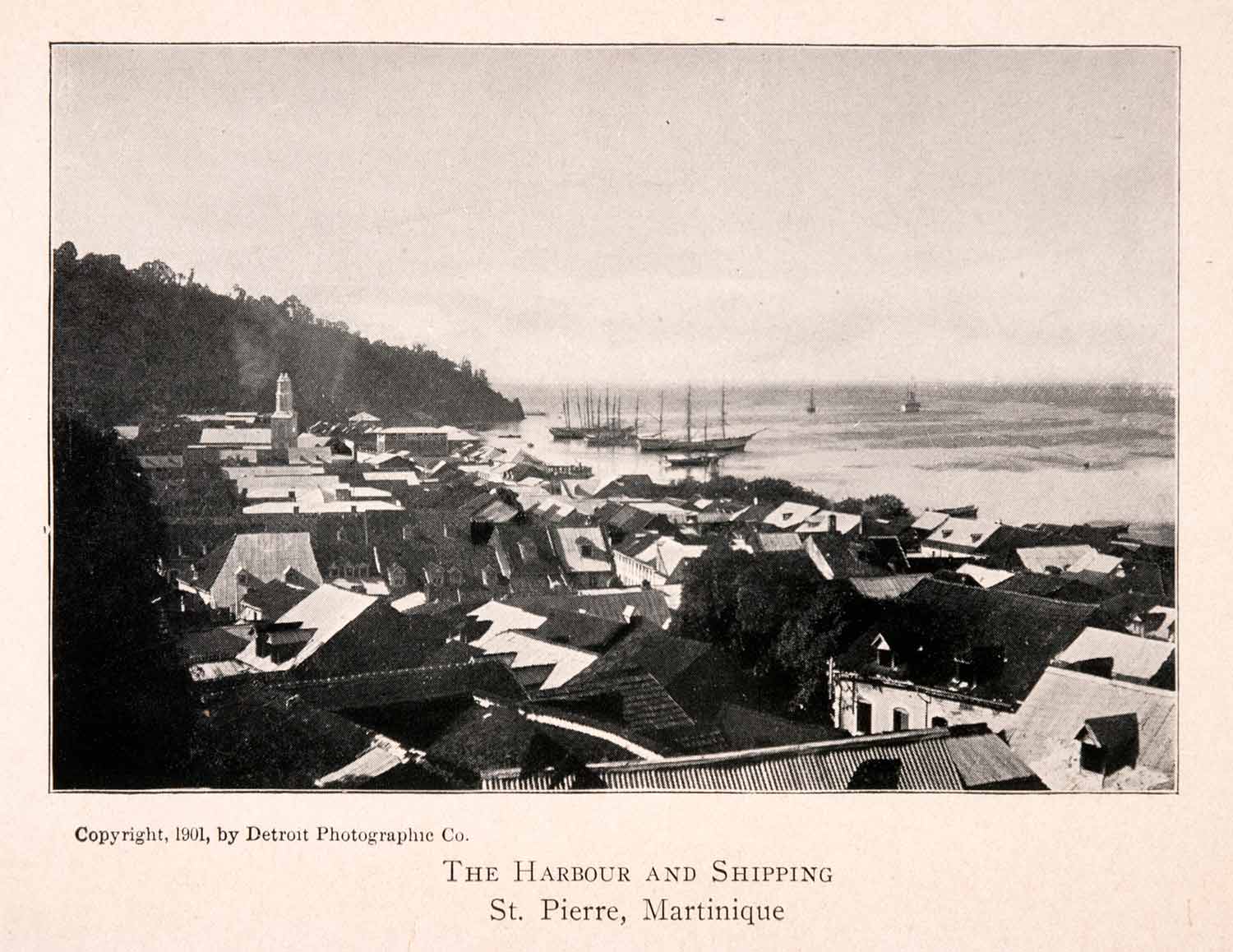 This is an original 1904 black and white halftone print of the harbor and docks at St. Pierre, on the Caribbean island of Martinique.