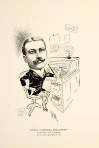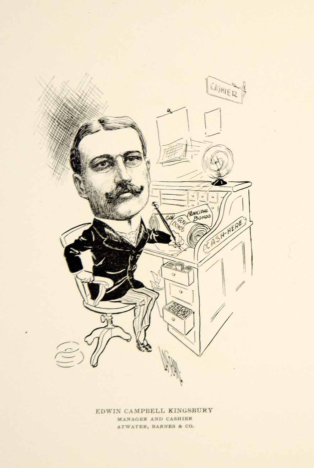 This is an original 1904 black and white in-text lithograph illustrated by L.A. Searle of Edwin Campbell Kingsbury, the manager and cashier of Atwater, Barnes & Company in Chicago.