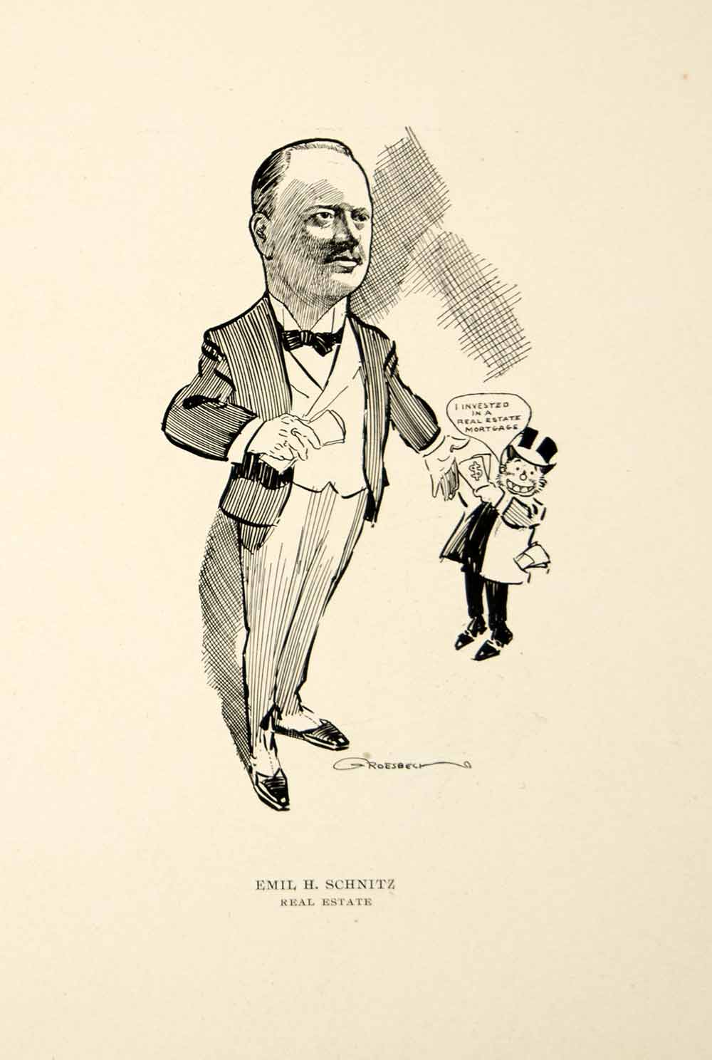 This is an original 1904 black and white in-text lithograph illustrated by D.S. Groesbeck of Emil H. Schnitz, a real estate agent from Chicago.
