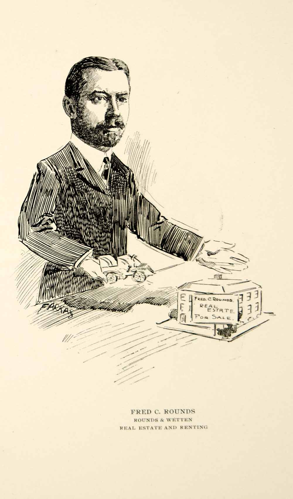 This is an original 1904 black and white in-text lithograph illustrated by Frank Farkas of Fred C. Rounds of Rounds & Wetten Real Estate in Chicago.