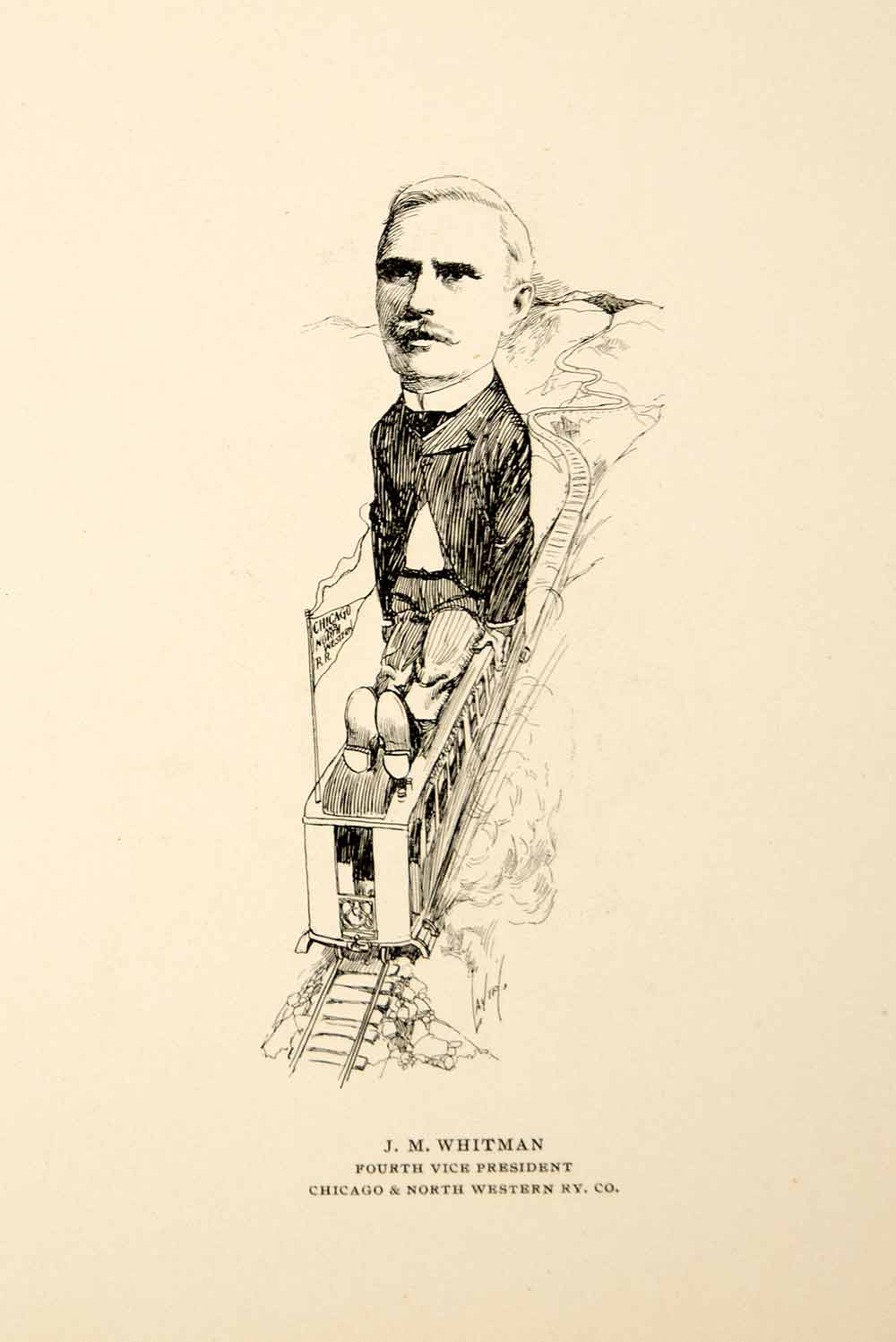 This is an original 1904 black and white in-text lithograph illustrated by D.J. Lavin of J.M. Whitman, the Fourth Vice President of the Chicago & North Western Railroad Company.