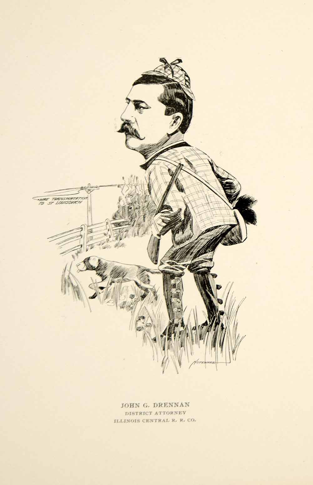 This is an original 1904 black and white in-text lithograph illustrated by F.A. Noteware of John G. Drennan, the District Attorney of the Illinois Central Railroad.