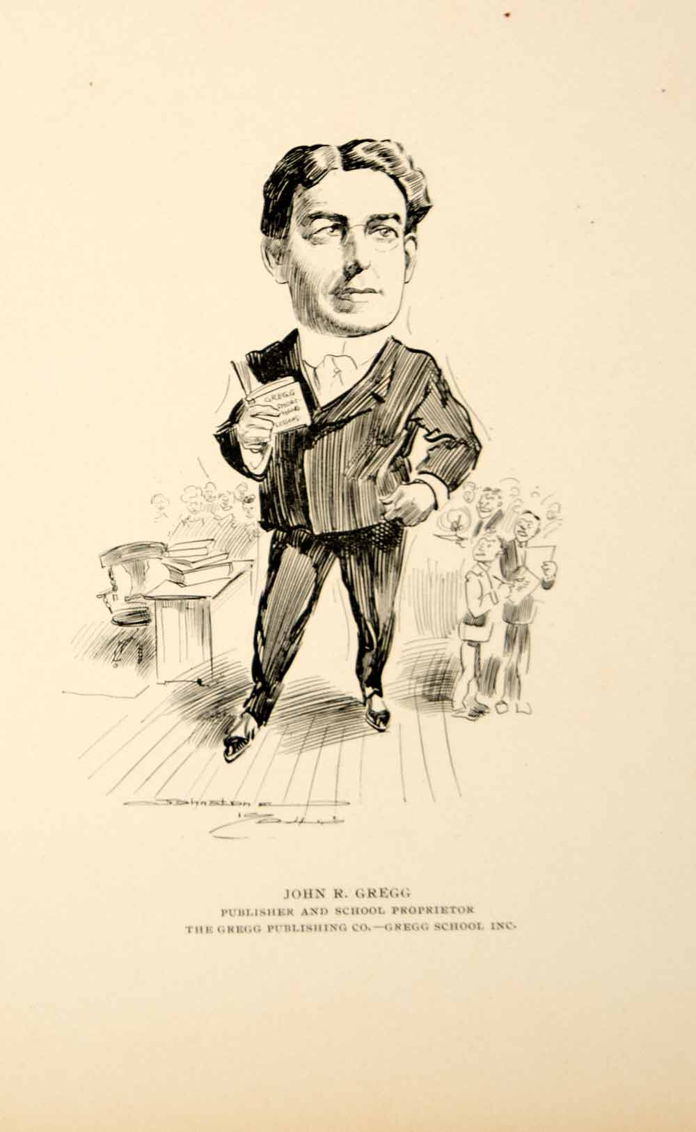 This is an original 1904 black and white in-text lithograph illustration by W.B. Johnstone of John R. Gregg, a publisher and school proprietor, for the Gregg Publishing Company in Chicago, Illinois.