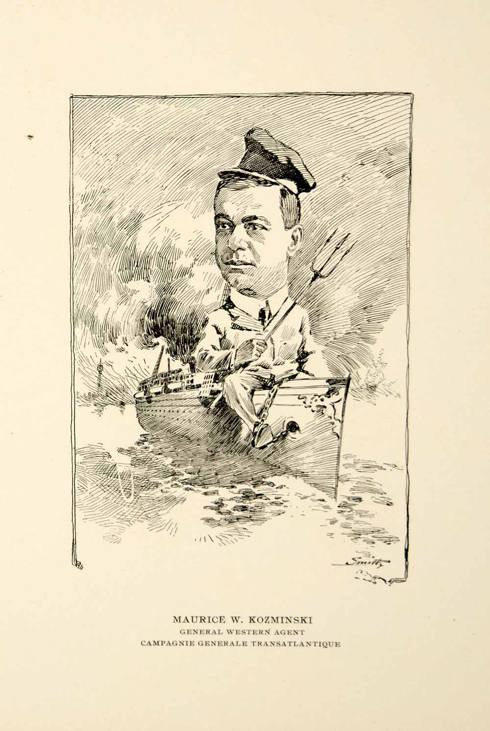 This is an original 1904 black and white in-text lithograph illustrated by E. Bert Smith of Maurice W. Kozminski, the General Western Agent of the Campagnie Generale Transatlantique.