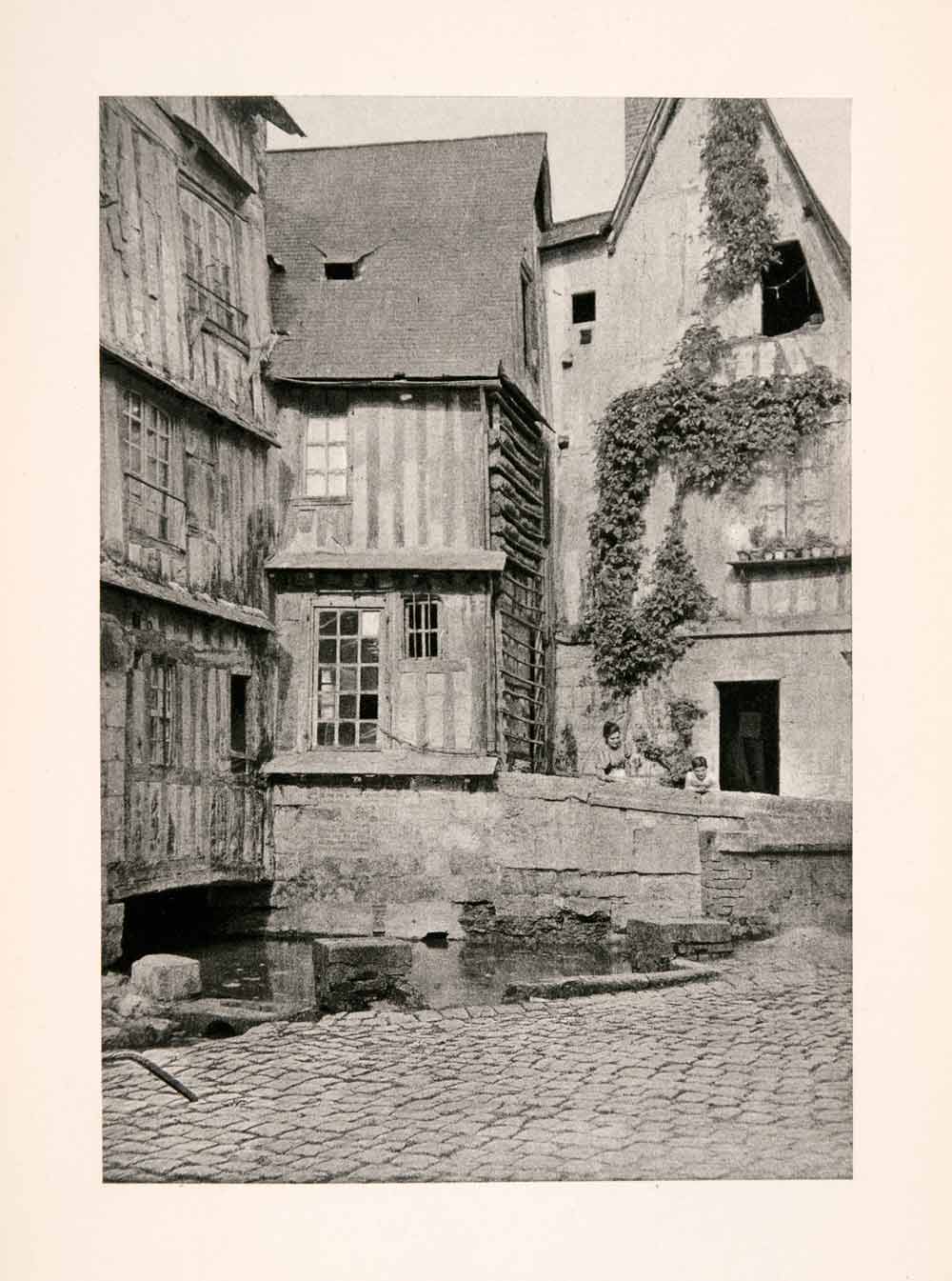 This is an original 1904 black and white photogravure of several half-timbered houses in Caudebec-en-Caux, a commune in the Seine-Maritime département in France.