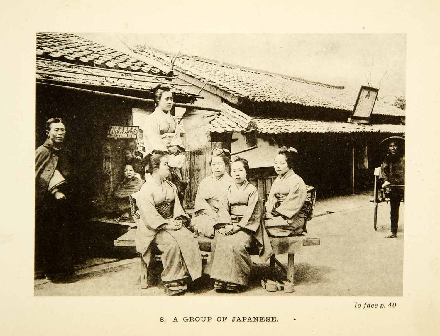 This is an original 1904 black and white photogravure that depicts a group of Japanese girls wearing traditional kimono.