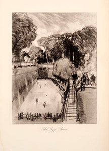This is an original 1904 black and white photogravure of an illustration by Joseph Pennell of a park in Siena, Italy.