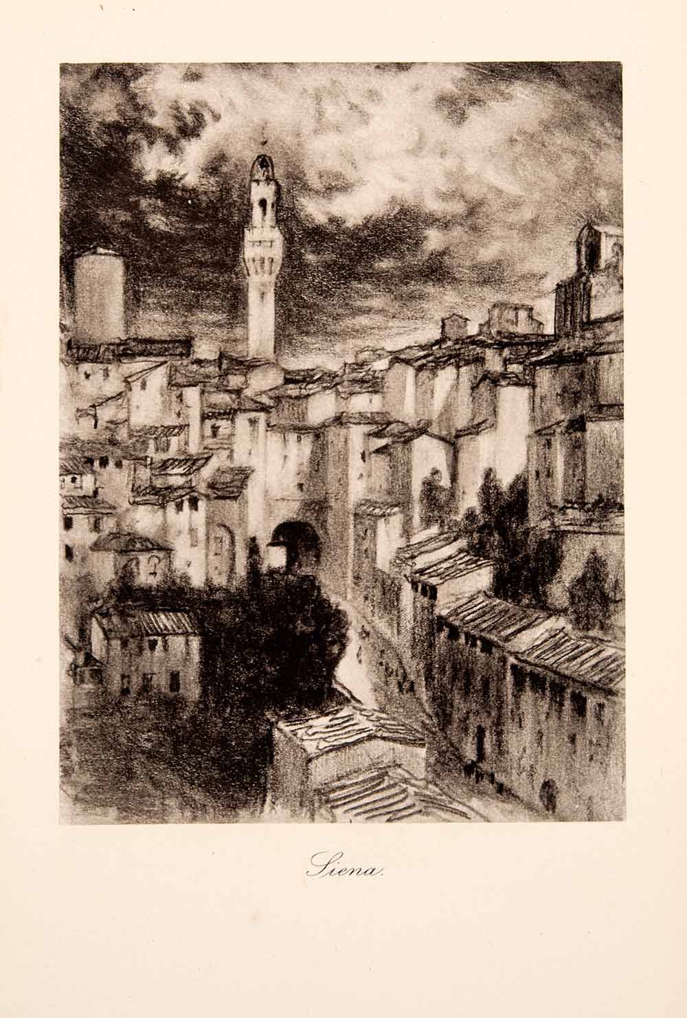 This is an original 1904 black and white photogravure of an illustration by Joseph Pennell of the city of Siena in Tuscany, Italy.