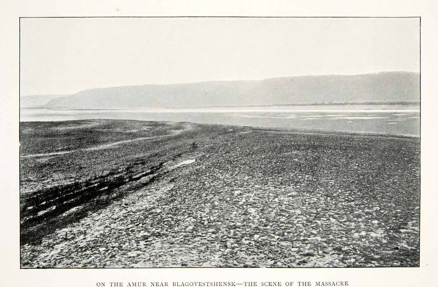 This is an original 1904 black and white halftone print of "On the Amur Near Blagovestshensk-- the Scene of the Massacre," in Russia.