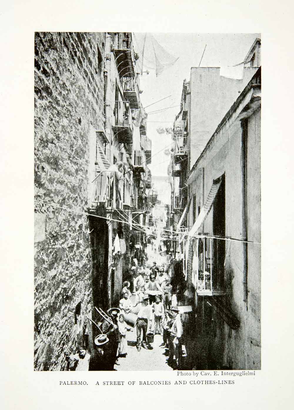 This is an original 1904 black and white halftone print of a street of balconies and clothes-lines in Palermo, Italy.