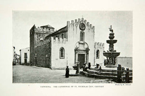 This is an original 1904 black and white halftone print of the Cathedral of Saint Nicholas at Taormina, Sicily, Italy.
