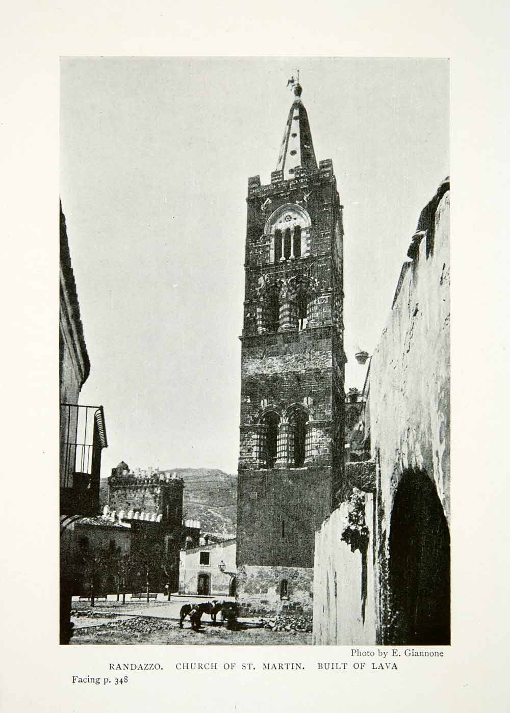 This is an original 1904 black and white halftone print of the Church of Saint Martin in Randazzo in Sicily, Italy. This building was made of lava.
