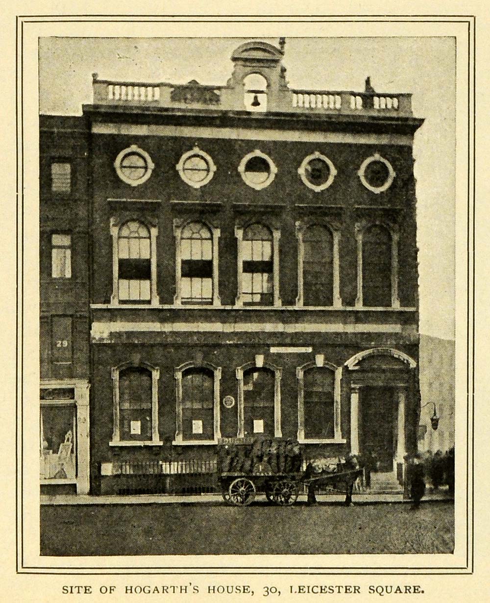 This is an original 1904 halftone print of English painter, cartoonist and pictorial and political satirist William Hogarth's home, located at 30 Leicester Square in London, England.
