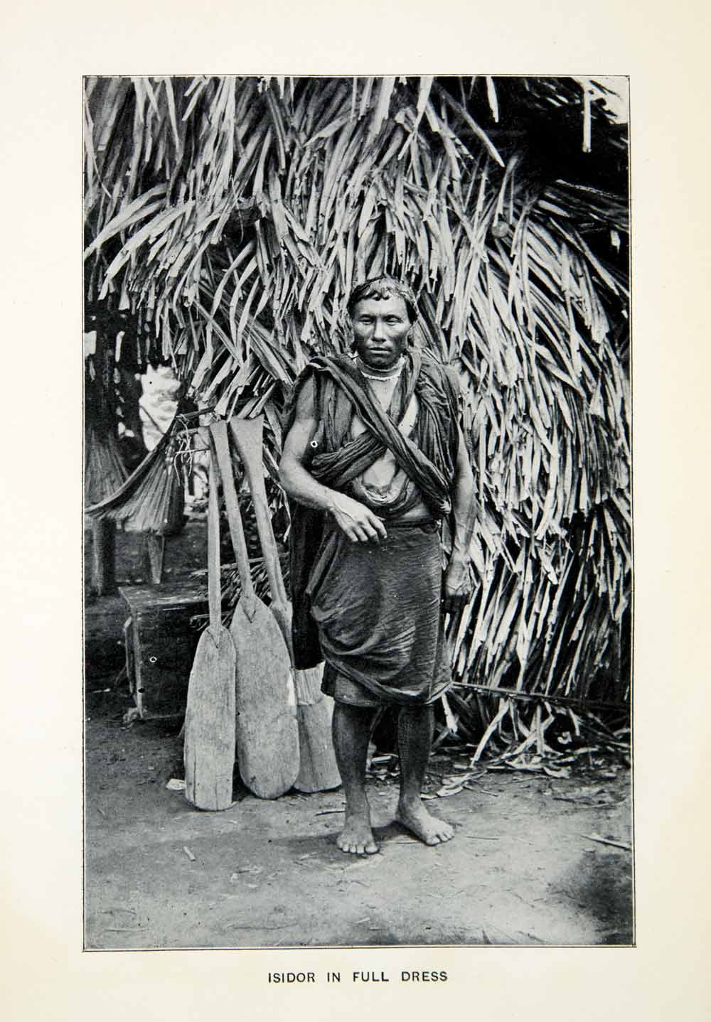 This is an original 1904 black and white halftone print of a portrait of Isidor of the Waiomgomos in Venezuela, dressed in traditional attire.
