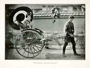 This is an original 1904 black and white halftone print of a woman in a jinrikisha (rickshaw) on the streets of Nagasaki, Japan.