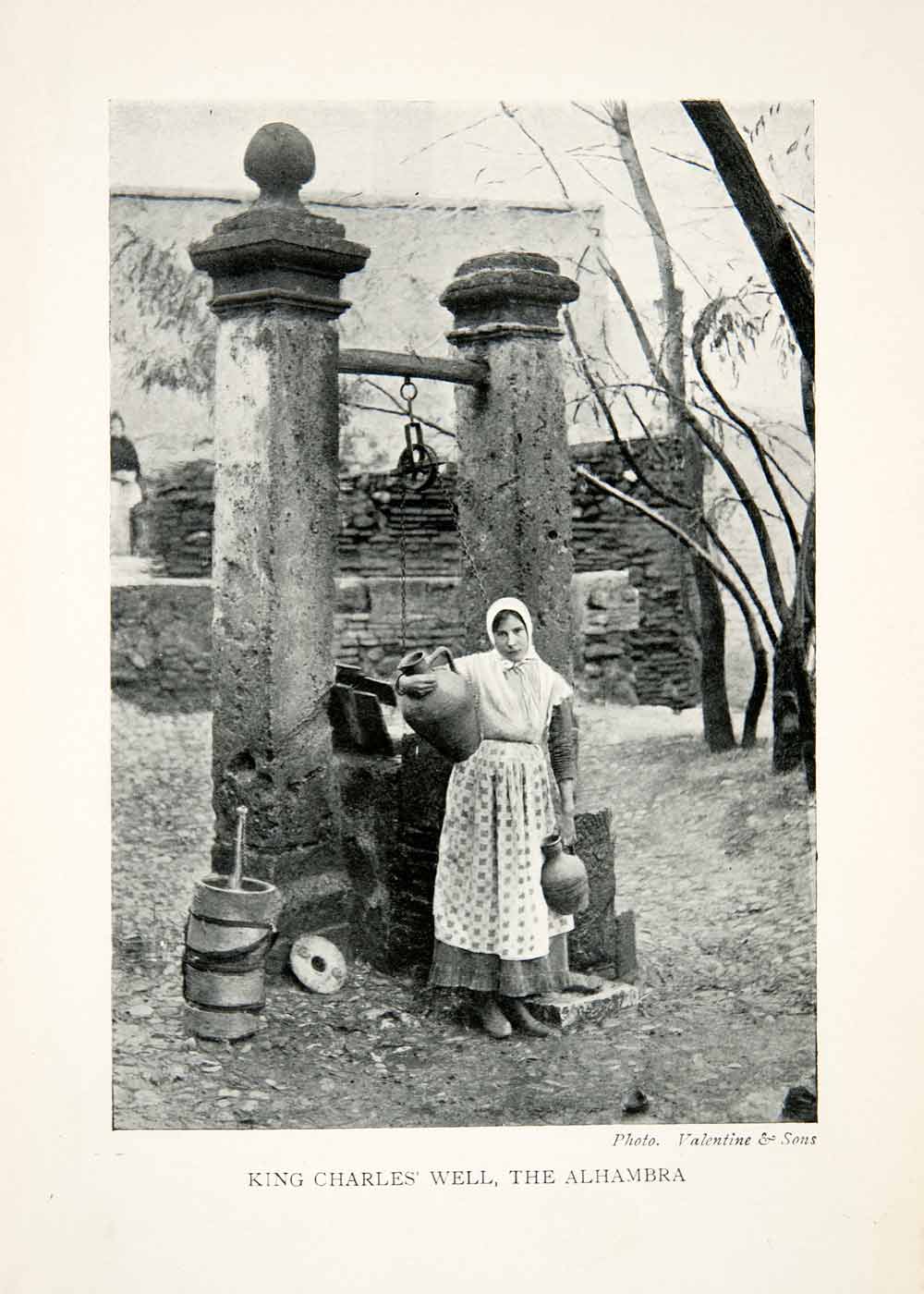 This is an original 1904 black and white halftone print of King Charles' Well at the Alhambra in Spain.