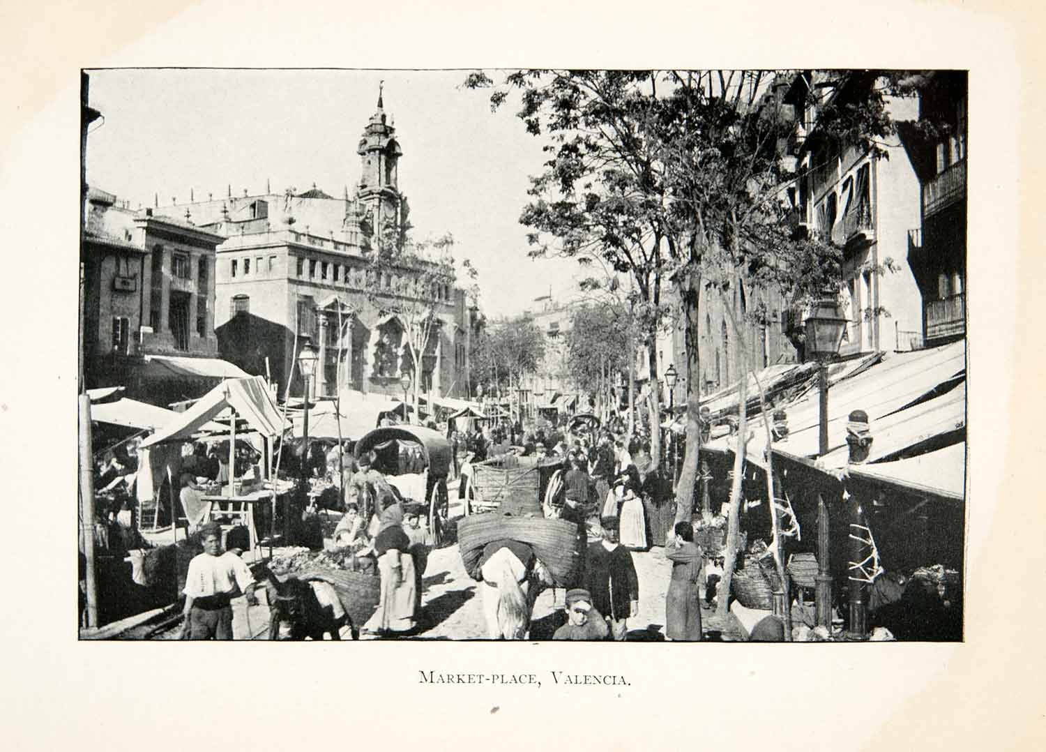 This is an original 1904 black and white halftone print of "Market-place, Valencia," in Spain.