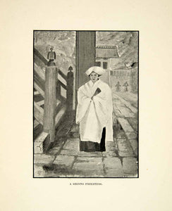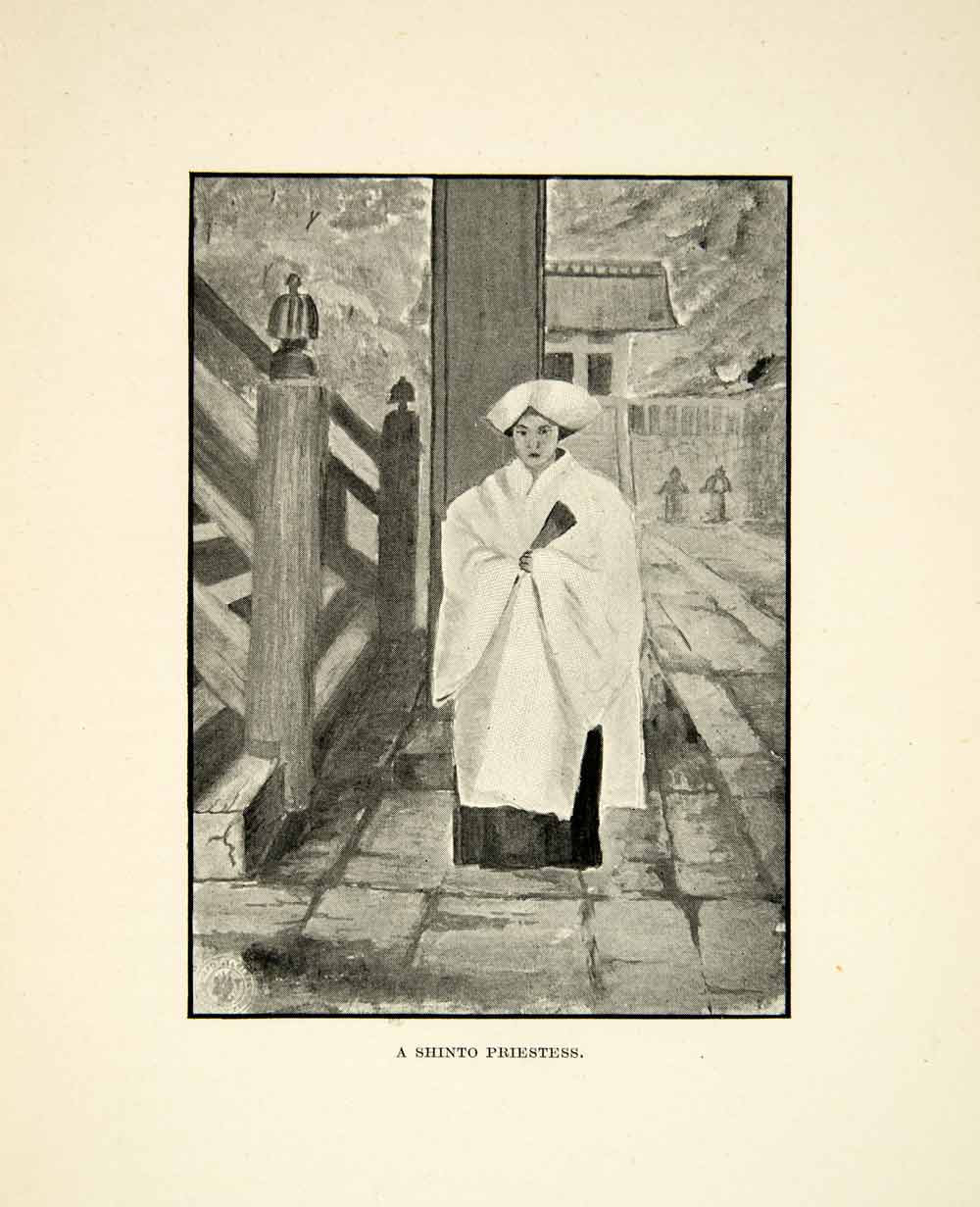 This is an original 1904 black and white halftone print of a Miko, or Japanese Shinto shrine maiden.