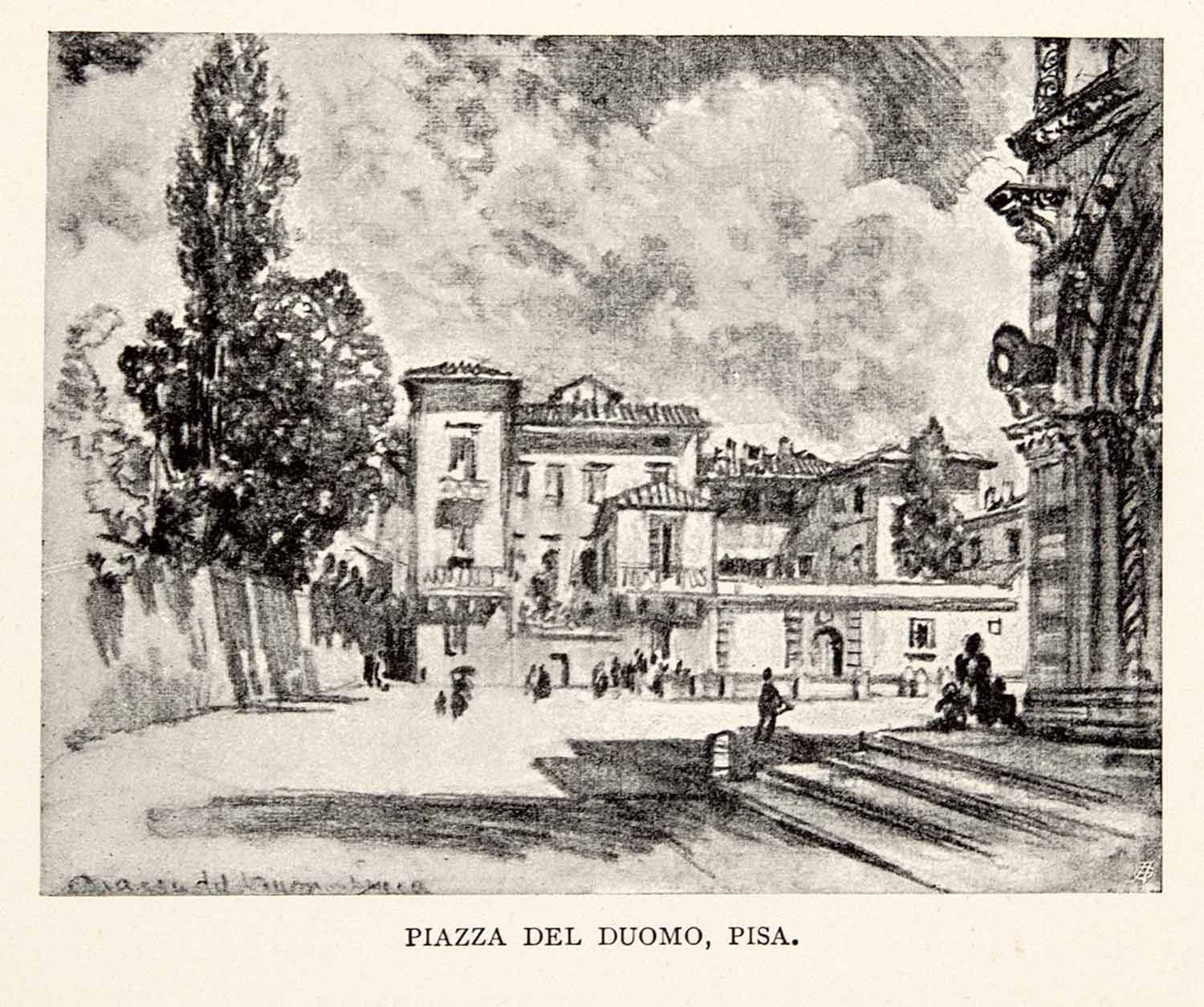 This is an original 1904 black and white halftone print of an illustration by Joseph Pennell of the Piazza die Miracoli in Pisa, Italy.