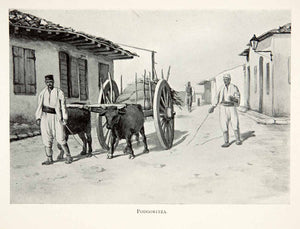 This is an original 1904 black and white halftone print of a street in the capital city of Montenegro, Podgorica (Podgoritza). This city is positioned at the confluence of two rivers: the Ribnica and the Moraca.