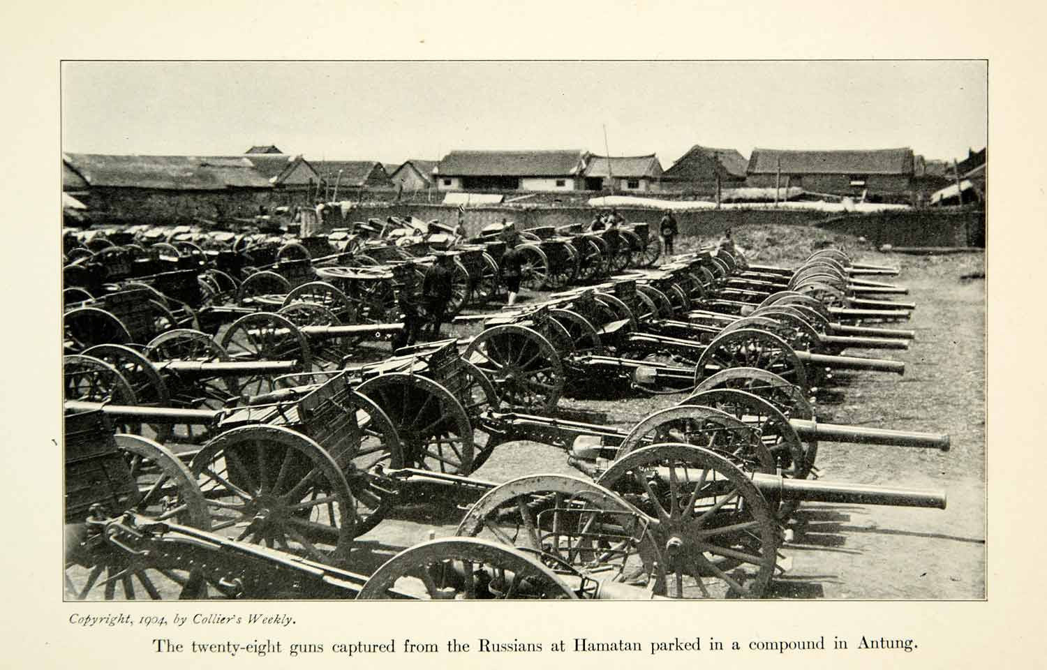 This is an original 1904 monochrome halftone print of twenty eight artillery pieces captured by Japanese forces at Hamatan, and stored at a compound in Antung during the Russo-Japanese War.