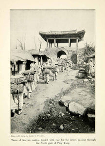 This is an original 1904 monochrome halftone print of Korean coolies carrying Japanese supplies through the North Gate of Ping Yang during the Russo-Japanese War.