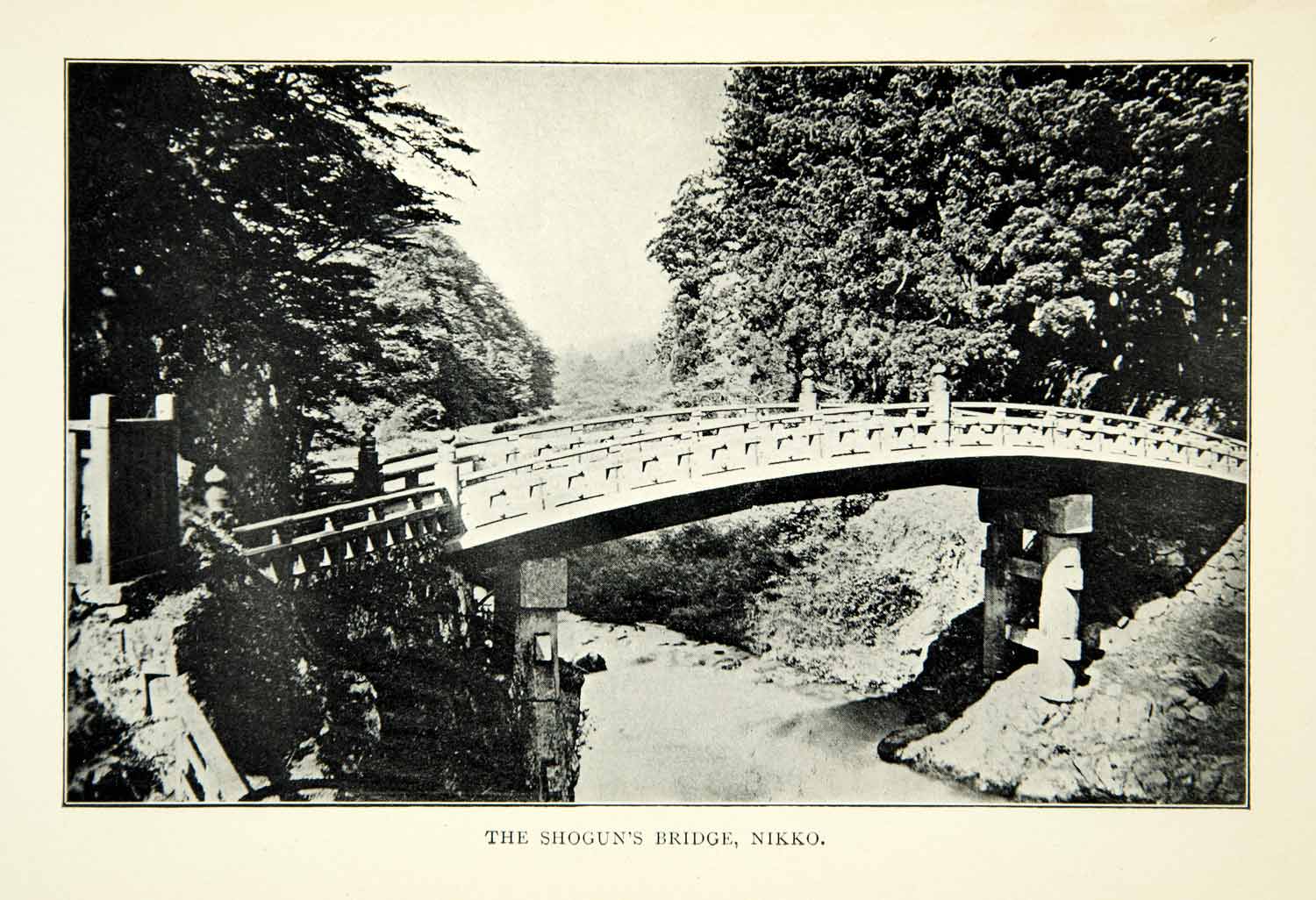This is an original 1904 black and white halftone print of the Shogun's Bridge in Nikko, Japan.